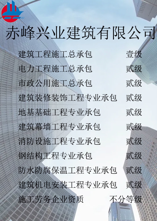 赤峰興業(yè)建筑有限公司簡介 赤峰興業(yè)建筑有限公司成立于1998年7月,位于內(nèi)蒙古赤峰市松山區(qū)。現(xiàn)已發(fā)展成為擁有建筑工程施工總承包壹級、電力工程施工總承包貳級、市政公用工程施工總承包貳級、承裝、修、試四級、?建筑裝修裝飾工程專業(yè)承包貳級、建筑幕墻工程專業(yè)承包貳級、消防設(shè)施工程專業(yè)承包貳級、地基基礎(chǔ)工程專業(yè)承包貳級、鋼結(jié)構(gòu)工程專業(yè)承包貳級、建筑機電工程專業(yè)承包二級、防水防腐保溫工程專業(yè)承包貳級以及建筑施工勞務(wù)等資質(zhì)的綜合性建筑施工企...